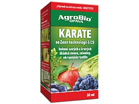 Působení přípravku: Přípravek KARATE SE ZEON TECHNOLOGIÍ 5 CS je pyrethroidní nesystemický insekticid proti širokému spektru žravého a savého hmyzu. Usmrcuje hmyz jako dotykový a požerový jed. Působí zejména proti žravým škůdcům (Lepidoptera, Coleoptera) jako kontaktní jed s výraznou účinností. Dále má velmi dobrou účinnost na savý hmyz (Homoptera). Pokud se přípravek použije pro časnou jarní aplikaci, má výrazné vedlejší účinky na svilušky (Tetranychidae). Vyznačuje se rychlou účinností (knockdown efekt) a dlouhým reziduálním působením. Je světlostabilní, což umožňuje jeho použití proti rozvlekle nastupujícím škůdcům. Dráždivé účinky vyvolávají neklid hmyzu a nutí i skrytě žijící druhy ke kontaktu s účinnou látkou. Má repelentní účinek. Přípravek dobře působí při nízkých teplotách do 20 – 25°C. Při vysokých teplotách účinnost klesá. Provádí se maximálně 1 ošetření za vegetaci, dávka přípravku nesmí překročit 5 ml / 100 m2.