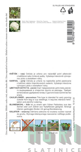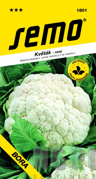 Květák Brassica oleracea convar. Botrytis / Karfiol BORA Velmi raná odrůda pro nejranější jarní polní pěstování ze sadby. Růžice je střední, smetanově bílá, částečně zakrytá, o průměrné hmotnosti 370 g. Je odolná proti fialovění, při velmi slunečném počasí je třeba ve sklizňovém období zalamovat listy, aby nedocházelo k výraznému žloutnutí růžic. Sklizňové období je konec května až polovina června. Vyžaduje intenzivní závlahu za největšího růstu a před sklizní. Vegetační doba 104 - 112 dní.