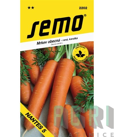 NANTES 5 (NANTÉSKÁ) Tradiční oblíbená odrůda rané karotky s delším, téměř válcovitým kořenem, tupě ukončeným. Povrch je hladký, červenooranžový. Dužnina je jemná, výborné chuti, červenooranžová, často se světlejším středem. Plastická odrůda pro rané sklizně. Ze 100 m2 lze sklidit 290 - 310 kg kořenů. Vegetační doba 115 - 125 dní.