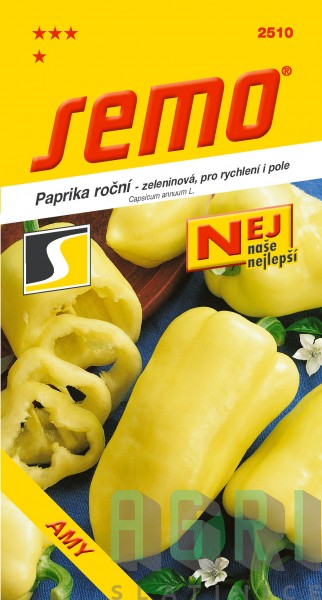Paprika roční Capsicum annuum / Paprika ročná AMY Odrůda nižšího vzrůstu určená pro sklizeň v technické zralosti zejména ve folnících , v jižních oblastech i ve volné půdě. Plod je bělozelený, tlustostěnný jehlanec velmi příjemné šťavnaté chuti, v botanické zralosti zářivě červený. První česká odrůda "maďarského"" typu. Při odpovídající agrotechnice vyniká vysokým výnosem. Ze 100 m2 lze sklidit 450 - 500 kg kvalitních lusků v technické zralosti."