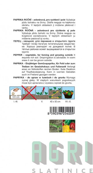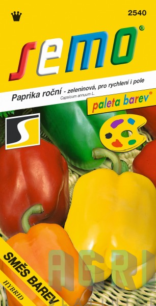 Paprika roční Capsicum annuum / Paprika ročná SMĚS BAREV ZELENINOVÁ F1 Směs silnostěnných kvadratických hybridů středního až vyššího vzrůstu určených pro pěstování ve sklenících a fólnících. Šťavnaté plody s vysokým obsahem vitamínu C jsou určeny hlavně pro přímý konzum. Při pečlivé agrotechnice a výživě vynikají vysokým výnosem. V teplejších oblastech Jižní Moravy a Jižního Slovenska je možno ji pěstovat i na poli. Osivo jednotlivých odrůd je v sáčku barevně odlišeno mořením - hybrid GELBY F1 žlutě, ORENY F1 oranžově a RUBIKA F1 červeně.