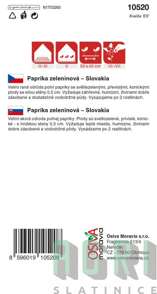 SLOVAKIA je velmi raná a produktivní odrůda polní sladké papriky. Plody jsou světle zelené a v botanické zralosti červené se stěnou silnou asi 0,5 cm. Mají šťavnatou, svěží a lahodně sladkou chuť