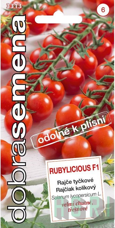 RUBYLICIOUS F1 ─ třešňové rajče kombinující vysokou odolnost k plísni s výtečnou chutí a vysokým obsahem cukru. Silné rostliny nesou v každém vijanu 12 ─ 25 menších plodů o hmotnosti 15 g. Hybrid je vhodný pro pole i nevytápěné skleníky. Vyniká výbornou odolností k plísni.