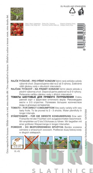 Rajče tyčkové Lycopersicon lycopersicum / Rajčiak kolíkový STUPICKÉ POLNÍ RANÉ Velmi raná odrůda s plody vynikající chuti. Poloindeterminantní odrůda vhodná především do okrajových oblastí. Doporučujeme vést 2 až 3 výhony s ukončením hlavního výhonu nad 4. - 6. výhonem. Lze jej také pěstovat jako keříčkové rajče bez vyvazování. Zaléváme větší dávkou vody v dlouhých intervalech