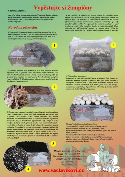 ŽAMPIONOVÝ SUBSTRÁT - hnědý Žampion hnědý nebo často nazývaný PORTOBELLO nebo-li žampion steakový je velmi aromatická houba hojně používaná, jak název napovídá, právě na gril. Tepelně se upravuje samostatně jen osolený na oleji nebo s kořením, s použitím různých nádivek. Náročnost úpravy žádná. Chutný výsledek zaručen !!!..... Návod: Neprorostlý žampiónový substrát ukládáme do teploty 20 - 24 °C. Při této teplotě substrát proroste mycelium za 18 - 20 dní. Při nižší teplotě trvá prorůstání déle.